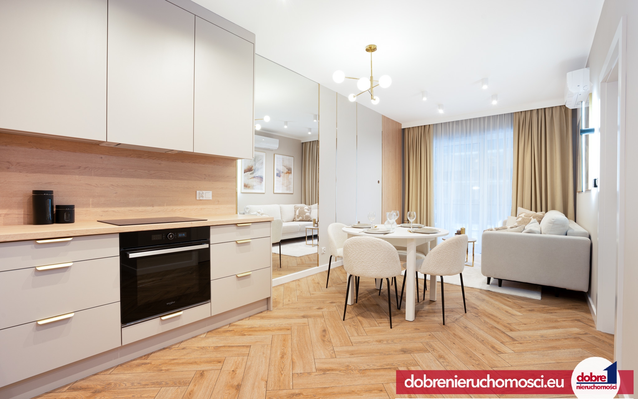 Kuchnia/Salon: Nowoczesny aneks kuchenny z minimalistyczną zabudową wraz z AGD oraz strefa jadalna z okrągłym stołem i krzesłami typu boucle. Salon wyposażony w klimatyzację.