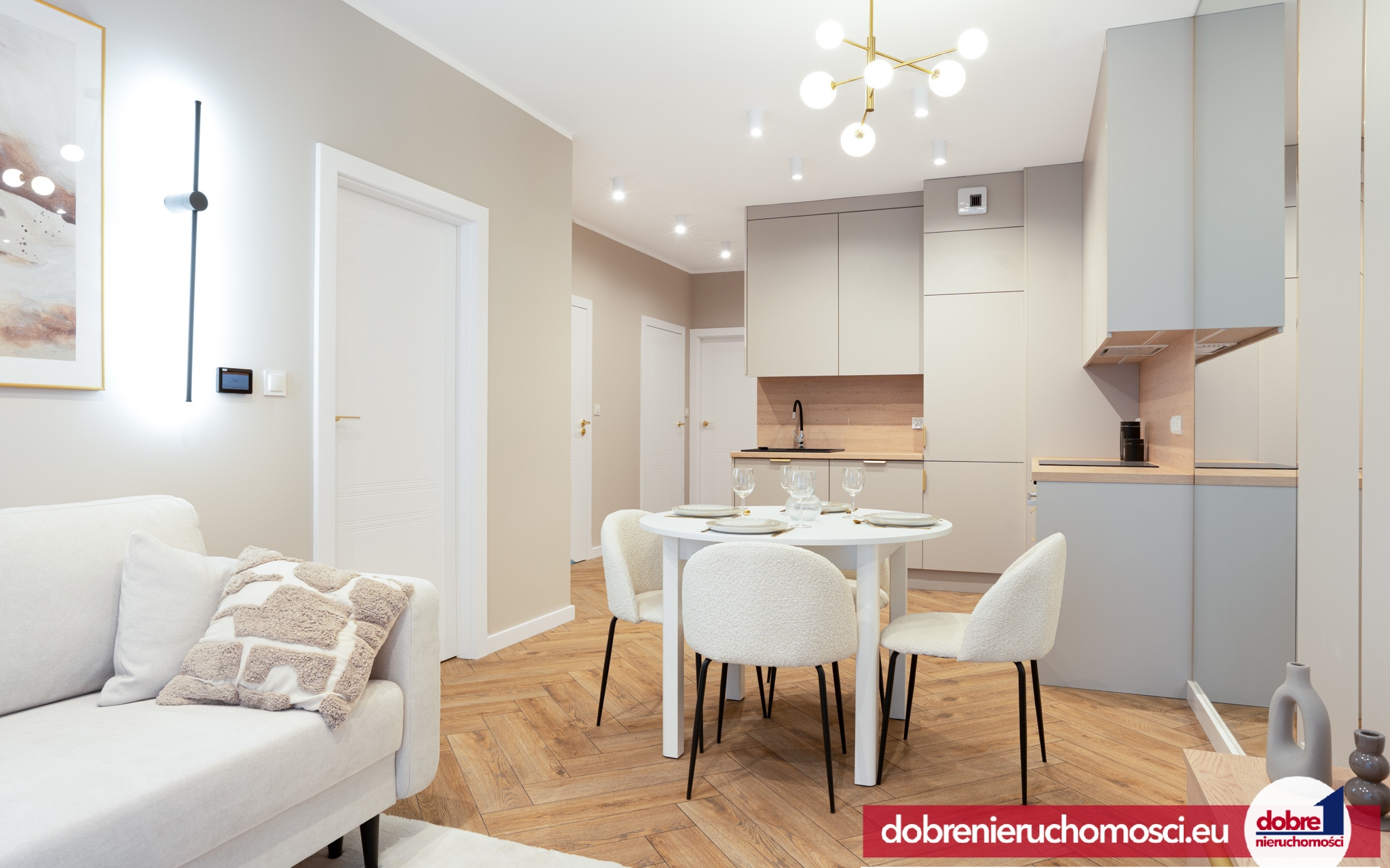 Podłogi: W całym mieszkaniu zastosowano wysokiej jakości podłogę ułożoną w modną jodełkę klasyczną.