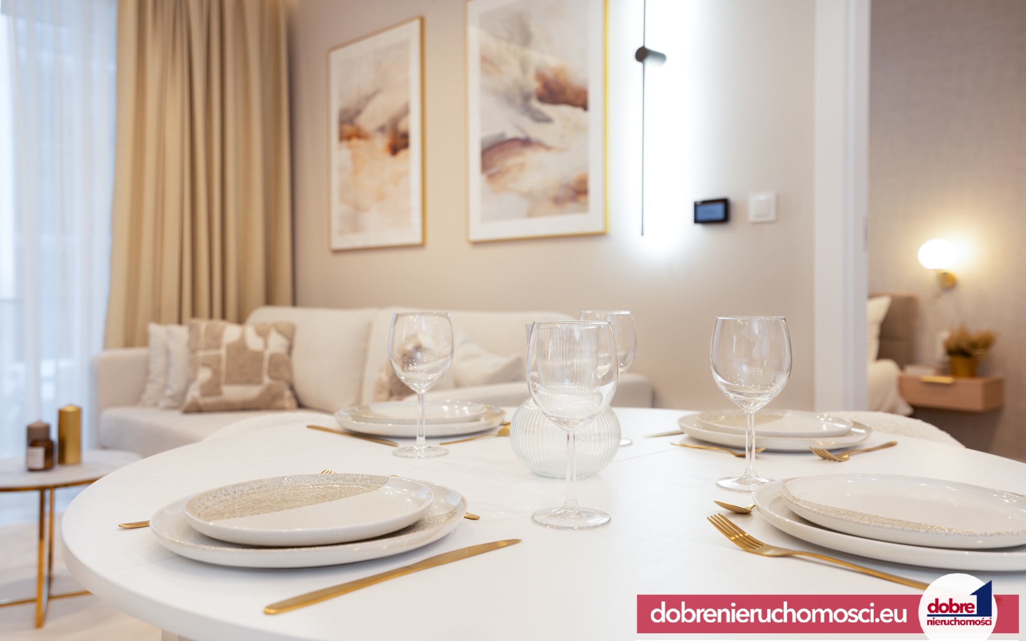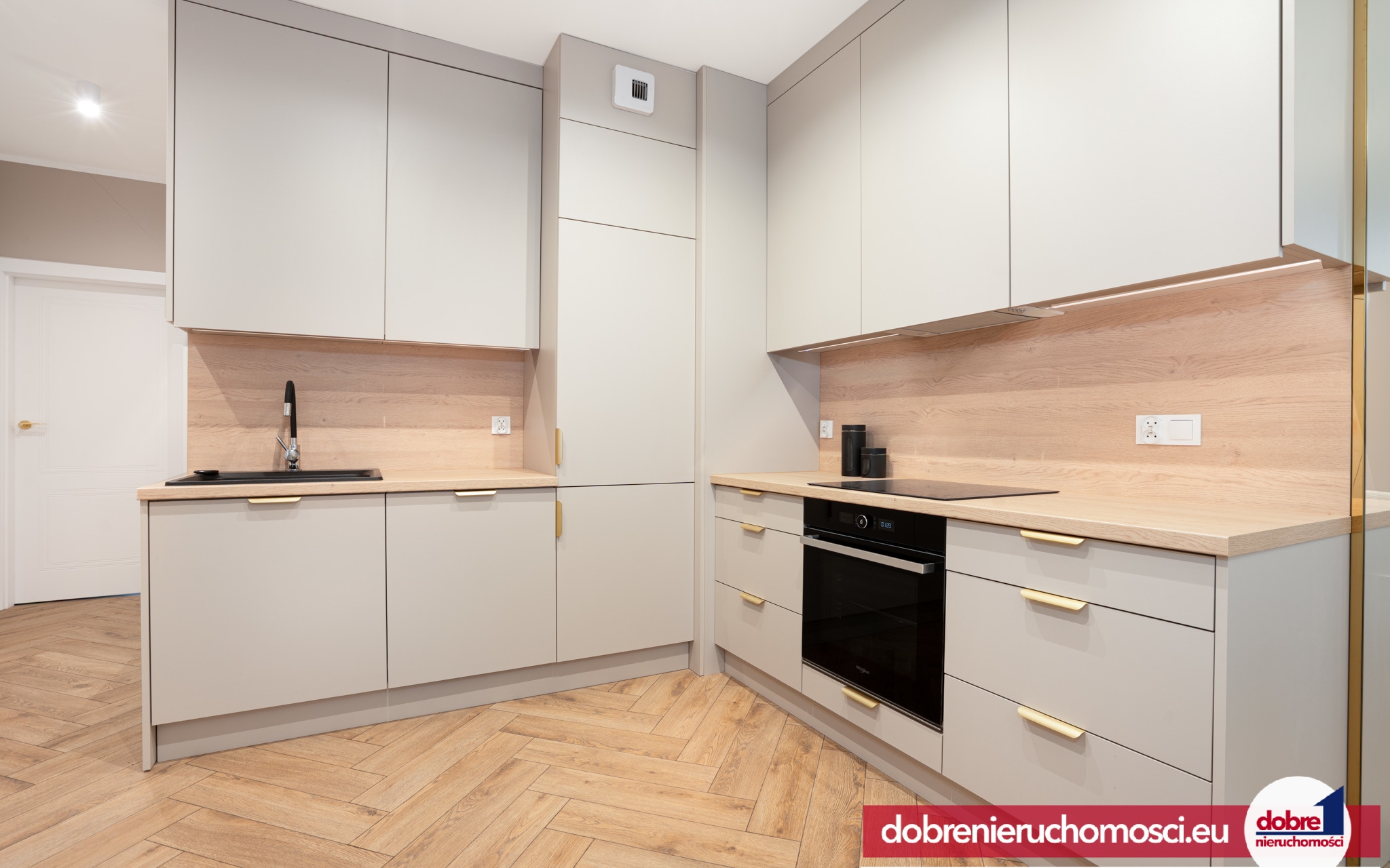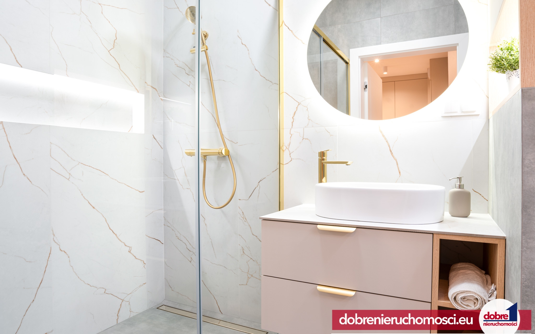 Styl i Kolorystyka: Dominują ciepłe, neutralne odcienie beżu, bieli i szarości, przełamane eleganckimi, złotymi akcentami (armatura, uchwyty, oświetlenie).