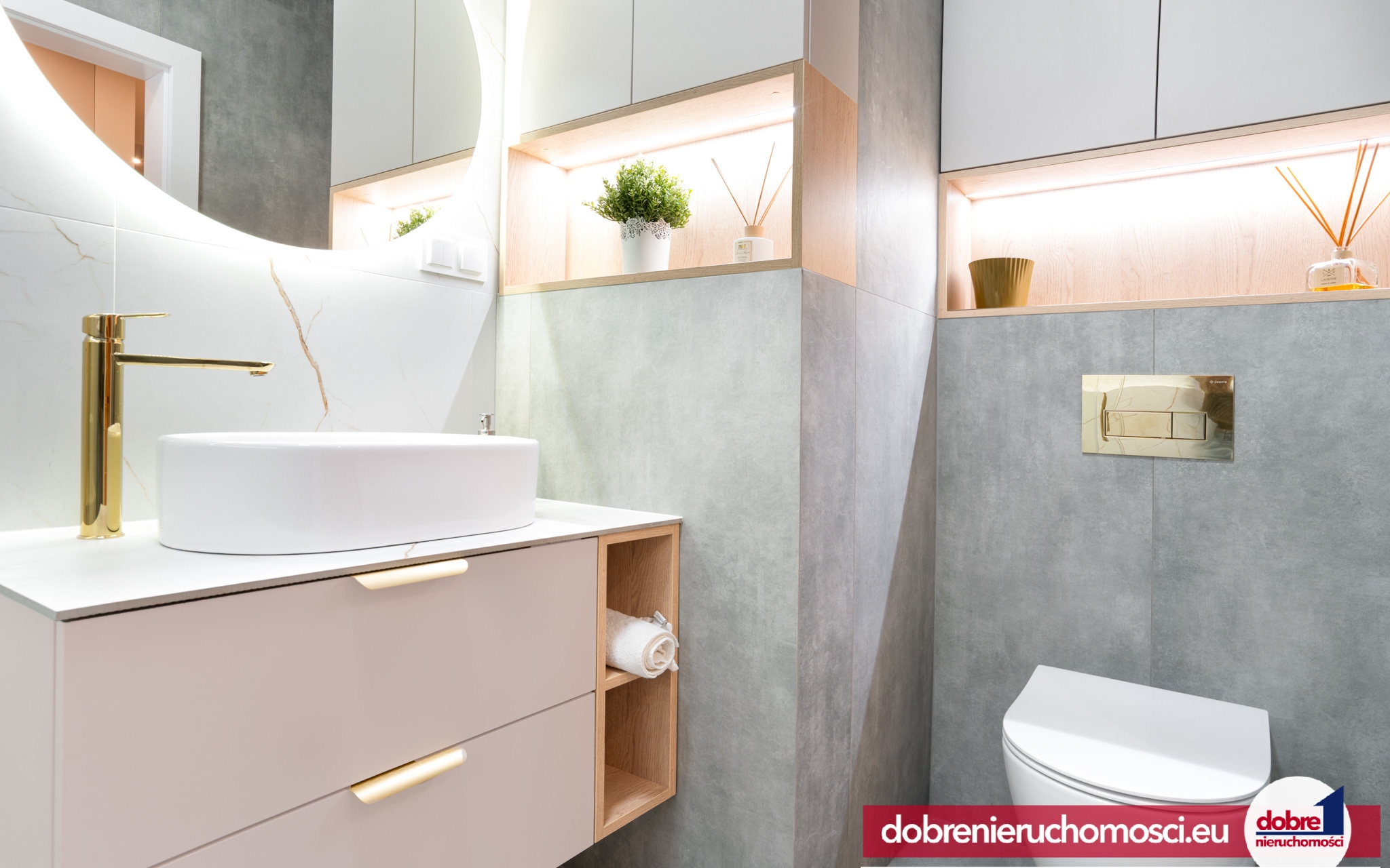 Łazienka: Wykończenie z białych płytek imitujących marmur ze złotymi żyłkami, kontrastujące z nowoczesnymi, szarymi płytkami. Złota, designerska armatura i podświetlane lustro tworzą strefę SPA.