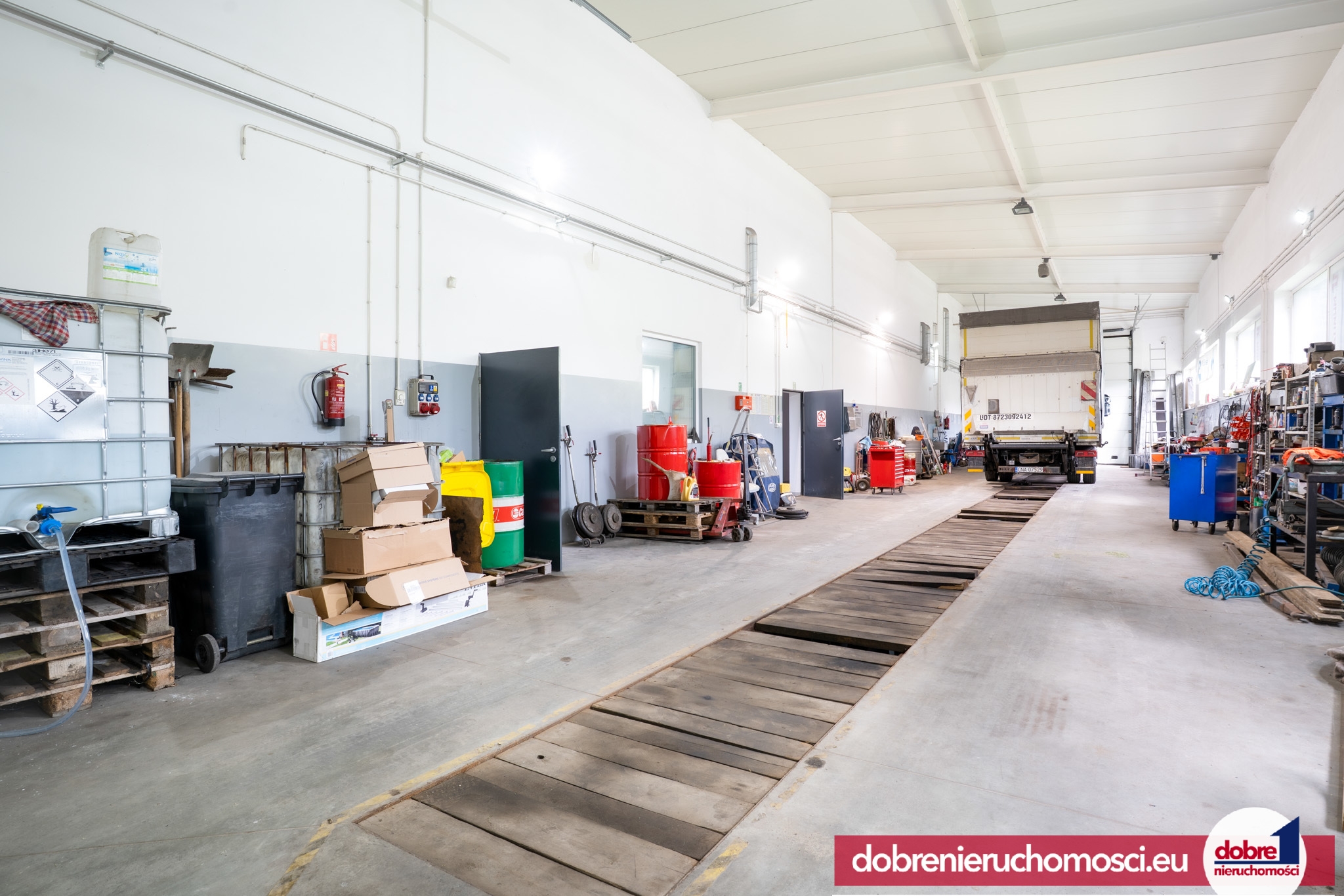 - Hala przejazdowa 204 m² (29 m x 7 m x 6 m) z kanałem i dwiema bramami (4 m x 4,5 m) – przystosowana pod pojazdy ciężarowe