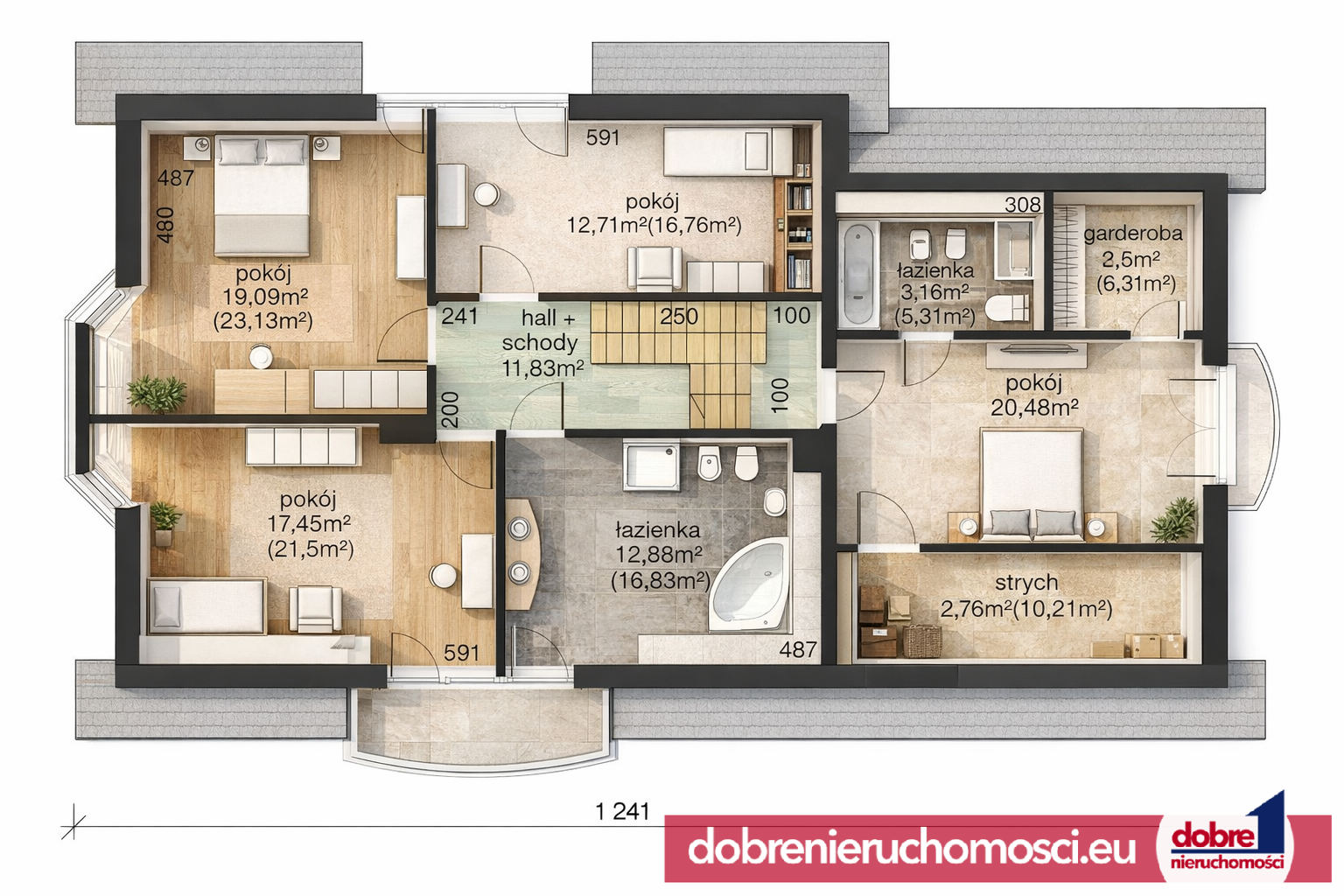 - strych – 2,76 m² (10,21 m² po podłodze)