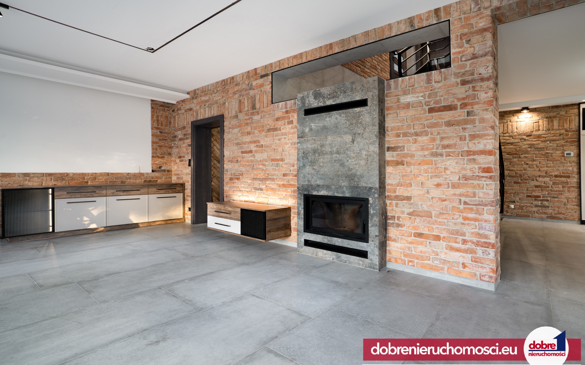 Podłogi wykończone efektownym gresem oraz bardzo ważnym punktem są liczne zdobienia z naturalnej czerwonej cegły dodające charakteru. Drzwi wewnętrzne z litego drewna zamawiane w prywatnym zakładzie. Dodatkowym atutem jest przepiękny kominek Defro.