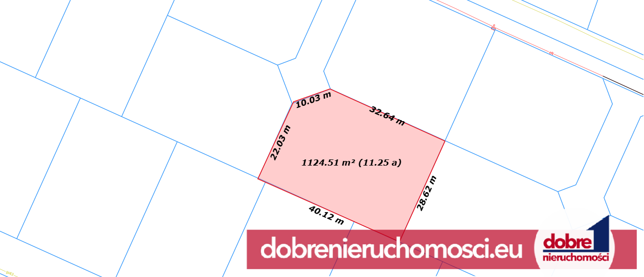 Działka o powierzchni 1110 m2, w kształcie zbliżonym do prostokąta. Wymiary: ok. 28m długości, ok. 40m szerokości. Podłoże płaskie.